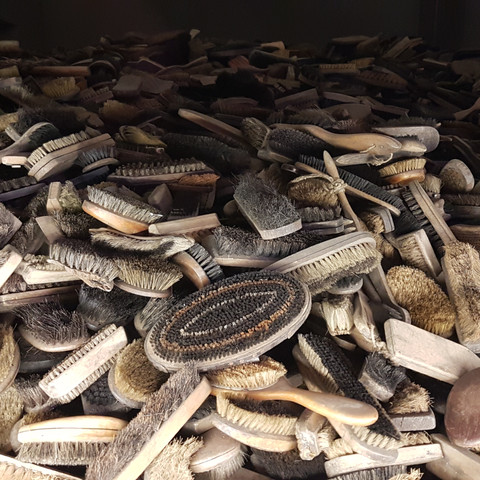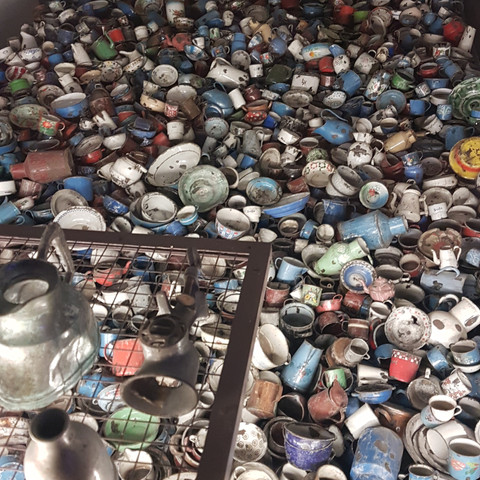 I enter another room. Human hair. Another room. What looks like thousands of shoes. Another room. Kitchen pots and pans and dishes and utensils.